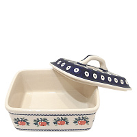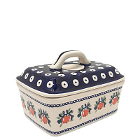 У этой масленки удобная ручка, нижняя часть выполнена в виде контейнера. В масленку помещается стандартный брикет масла. Также в ней удобно хранить сыр или паштет. Керамическая посуда обладает свойствами термоса, удерживая нужную температуру, и за счет этих свойств масленка прекрасно сохраняет сливочное масло холодным и без холодильника.
